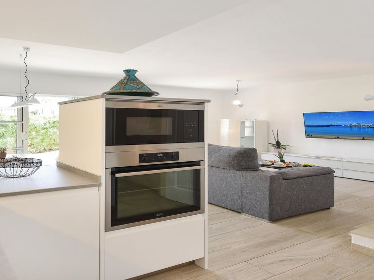 "Marina port 15", 3-Zimmer-Wohnung 81 m2. Objekt geeignet für 4 Erwachsene. Hell, sehr einfach und gemütlich eingerichtet: Wohn-/Esszimmer mit TV, Flachbildschirm und Klimaanlage. Ausgang zum Gartensitzplatz. Offene Küche (Backofen, Geschirrspüler, 4 Glaskeramikplatten, Toaster, Wasserkocher, Mikrowelle, elektrische Kaffeemaschine) mit Esstisch. Bad. Obergeschoss: 1 Zimmer mit 1 Doppelbett. Ausgang zur Loggia. 1 Zimmer mit 1 Doppelbett. Bad/Dusche. Gartensitzplatz, Laube. Terrassenmöbel, Gartengrill, Liegestühle (6). Zur Verfügung: Waschmaschine, Wäschetrockner, Bügeleisen, Kinderhochstuhl, Babybett bis 2 Jahre, Haartrockner. Internet (WLAN). Bitte beachten: geeignet für Familien. Nichtraucher-Unterkunft. 2021-T5860 // Reg. Nr.: ESFCTU0000350120001817460000000000000000VV35100160255