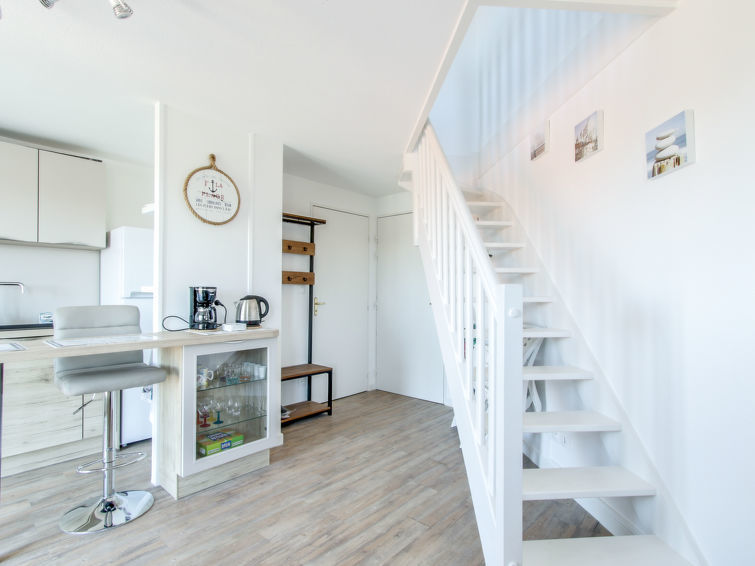 Appartement 2-kamers 35 m2 op 2 verdiepingen op de 2e verdieping, op het noordwesten gelegen. Woon-/eetkamer met TV (Flatscreen TV), elektrische rolluiken. Uitgang naar het balkon. Kookhoek (afwasmachine, 3 inductiekookplaten, broodrooster, waterkoker, magnetron, diepvriezer, elektrische koffiemachine) met bar. Aparte WC. Elektrische verwarming. Bovenverdieping: 1 kamer met 1 2-pers bed (140 cm, lengte 190 cm). Douche/WC. Parketvloeren. Balkon 5 m2. Balkonmeubilair. Mooi uitzicht in de verte op zee en de rivier. Ter beschikking: haardroger. Internet (Internet (WiFi), extra). Parkeerplaats nr. 2831. Rookmelders.