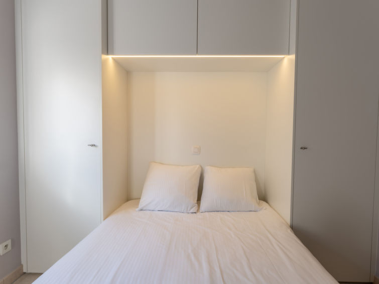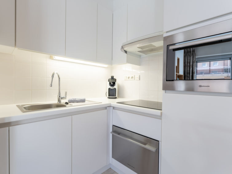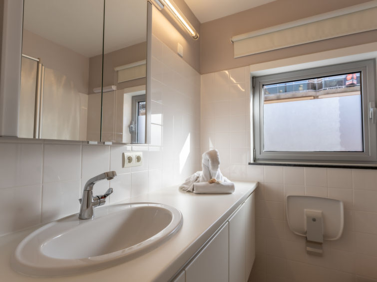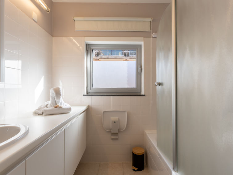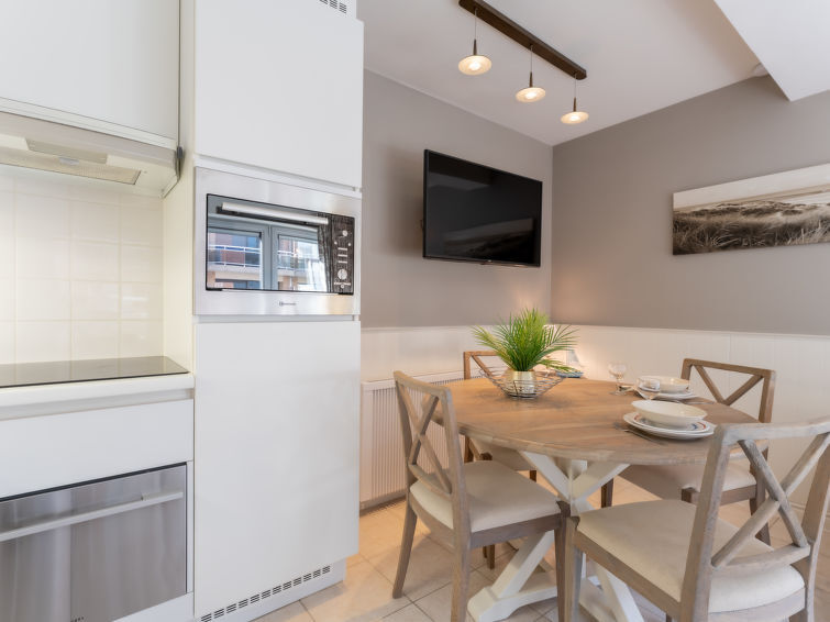 "Shop & Sea", appartement 2-kamers op de 2e verdieping. Licht, comfortabel en gezellig ingericht: open woon-/eetkamer met 1 divanbed (90 cm, lengte 200 cm), eettafel, aparte WC, Digitale TV en internationale TV-zenders. 1 2-pers. kamer met 1 2-pers bed (160 cm, lengte 200 cm). Open keuken (afwasmachine, 4 keramische glas kookplaten, broodrooster, waterkoker, elektrische koffiemachine, combimagnetron). Bad/douche. Verwarming. Ter beschikking: haardroger. Internet (WiFi, gratis). Rookvrij huis. Maximaal 1 klein huisdier/hond toegestaan. Rookmelders, brandblusser.
